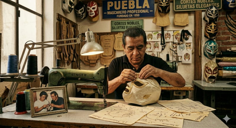 特に「千の顔」を持つマスカラスや、「青い王子」アニバルにとって、プエブラのマスクは単なる衣装の域を超え、自らの神秘性を完成させるための「顔の彫刻」に他なりませんでした。かつて巨大アリーナを熱狂させた英雄たちの威厳は、プエブラが踏むミシンのリズムとともに刻み込まれていったのです。