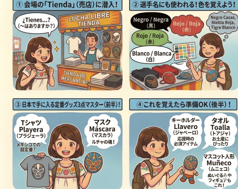 ですが、日本のプロレス会場の物販の充実は世界一!今回は、日本の会場で手に入る定番グッズ6点のスペイン語名を覚えていきましょう。これ等の名前を憶えて是非日本の売店やイベントの即売会で活用してください。