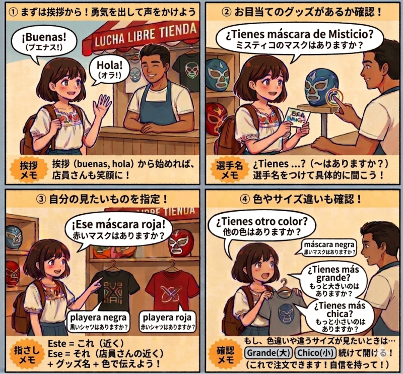 ちょっと難しく感じるかもしれませんが、まずは「Playera(Tシャツ)やMáscara(マスク)の時は色の語尾“a” にする!」とだけ覚えておけば、売店でのやり取りは完璧ですよ!