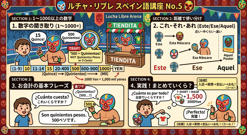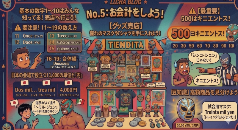 今回は、ルチャファンなら絶対に避けては通れない「数字の聞き取り」をマスターします。初心者がつまずきやすい特殊な数え方から、メキシコの売店で聞き取れないとパニックになる「魔の数字」、さらには日本のプロレス会場でも役立つ「円(Yen)」を混ぜたリアルな数字のやり取りまで。